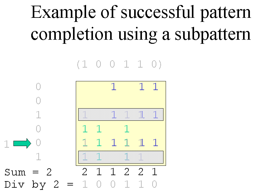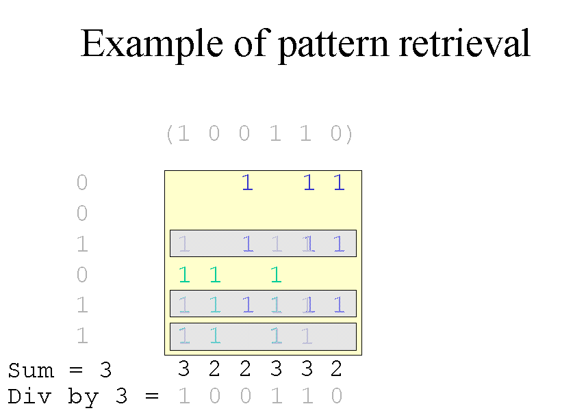 Het ophalen van een patroon gaat als volgt (zie fig. 2): presenteer een inputpatroon aan het model. Bereken voor elke outputknoop de input. Dit doe je door te kijken naar alle actieve inputknopen. Als het gewicht tussen een actieve inputknoop en de outputknoop 1 is, tel 1 op bij de input. De input is dus gelijk aan het aantal actieve inputknopen die verbonden zijn met de outputknoop. Vervolgens deel je de input van elke outputknoop door het aantal actieve inputknopen. In fig. 2 zijn er drie actieve inputknopen, dus wordt de input van elke outputknoop gedeeld door 3. Elke outputknoop die nu een input heeft van 1 (hoger kan niet, aangezien een gewicht enkel gelijk aan 1 kan zijn) geldt als actief, elke knoop die een lagere input dan 1 heeft geldt als niet actief. De actieve outputknopen vormen nu het opgehaalde outputpatroon (onderste regel in fig. 2). Dat patroon kan je vergelijken met het oorspronkelijk geleerde outputpatroon, dat in fig. 2, tussen haakjes, boven de gewichtenmatrix is gezet. In fig. 2 is dit patroon perfect opgehaald.